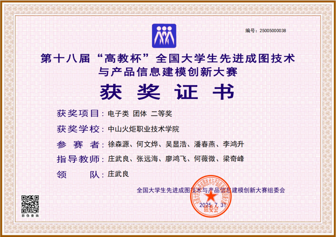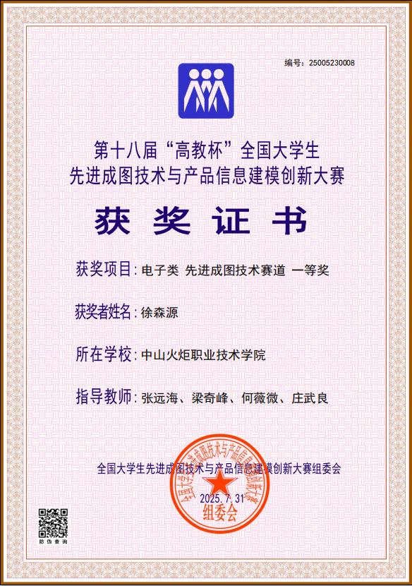 近日,中山火炬職業(yè)技術(shù)學(xué)院光電信息學(xué)院學(xué)子收到了來自第十八屆“高教杯”全國大學(xué)生先進(jìn)成圖技術(shù)與產(chǎn)品信息建模創(chuàng)新大賽的獲獎證書。經(jīng)過省賽選拔、國賽競技的層層角逐,該校學(xué)子在全國高校精英云集的賽場中奮勇爭先、多點(diǎn)開花,最終斬獲亮眼成績——應(yīng)電233班徐森源以優(yōu)異的表現(xiàn)拿下全國一等獎(全國排名第8),應(yīng)電243班何文燁躋身全國一等獎行列(全國排名第53),應(yīng)電244班吳顯浩斬獲全國二等獎,光電231班潘春燕榮獲全國三等獎,參賽團(tuán)隊(duì)同步喜提團(tuán)體賽全國二等獎。
