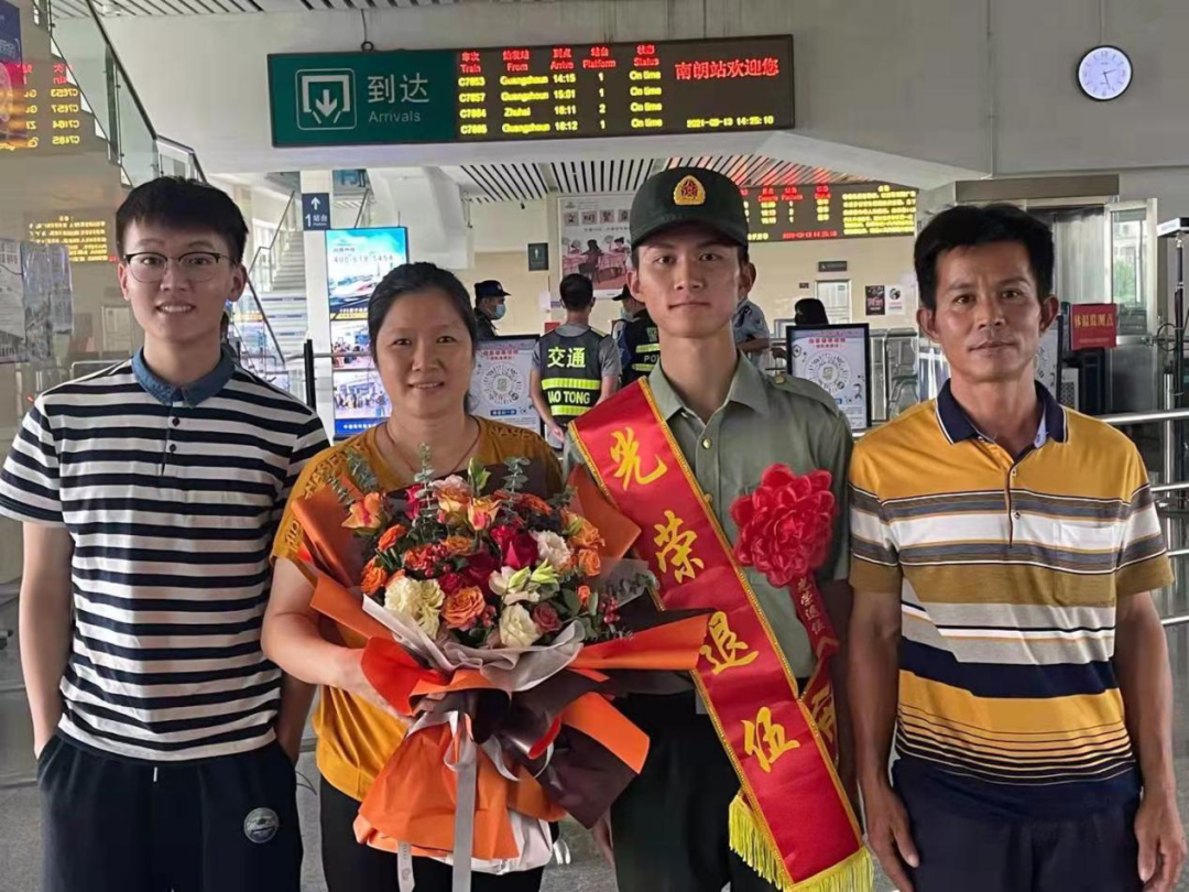 “去時鑼鼓喧天,歸來夾道歡迎。” 九月,正是退役軍人 從祖國各座軍營 返回家鄉(xiāng)的退役季 為營造“一次參軍、一生光榮”的濃厚氛圍 讓退役軍人感受到家鄉(xiāng)人民的熱情和關(guān)懷 激發(fā)老兵退伍不褪色 返鄉(xiāng)建新功的壯志熱情 9月13日下午,五桂山街道2021年首位退役軍人曾世紀光榮退役返鄉(xiāng)。街道退役軍人服務(wù)中心負責(zé)人、社區(qū)“兩委”干部、工作人員以及曾世紀的父母早早手持鮮花,在城軌南朗站等候迎接世紀回家。 回想2019入伍歡送大會時曾世紀代表五桂山即將入伍的新兵作表態(tài)發(fā)言,那年,他主動請纓,到艱苦邊遠地區(qū)服役?!皡④姴粌H是個人的榮耀,也是家人的榮耀,更是鄉(xiāng)親們的榮耀。到了部隊后我會堅決服從命令,聽從指揮,刻苦訓(xùn)練,勤學(xué)本領(lǐng),絕不辜負家鄉(xiāng)人民的期望!”
