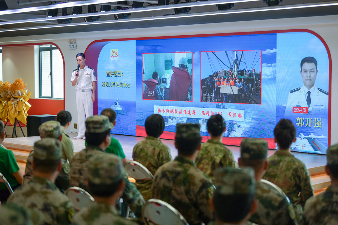 郭開強:勇闖大洋 為國爭光 2008年12月,應(yīng)聯(lián)合國授權(quán)請求,奉中央軍委命令,南海艦隊武漢艦、??谂?、微山湖艦組成第1批護航編隊,拉開了人民海軍舉世矚目的亞丁灣、索馬里護航序幕,這是自600多年前鄭和下西洋以來,中國真正意義上的遠(yuǎn)海非戰(zhàn)爭軍事行動,開啟了人民海軍從“黃水”駛向“藍(lán)水”的壯麗航程。 91878部隊郭開強干事為大家?guī)碇黝}宣講《勇闖大洋 為國爭光》。 郭開強介紹—— 迄今為止,人民海軍已累計派出44批100余艘次艦艇參加亞丁灣、索馬里海域護航,完成1500多批7000余艘中外船舶護航任務(wù),解救、接護各類船舶近百艘,其中外國船舶超過50%。 護航官兵一次次直面生死、一次次化解危機、一次次挑戰(zhàn)極限,用忠誠與奉獻、責(zé)任與擔(dān)當(dāng),彰顯大國海軍形象,譜寫了人民海軍邁向世界一流海軍的新時代壯歌。 張長城分享軍旅故事。記者 易承樂 攝