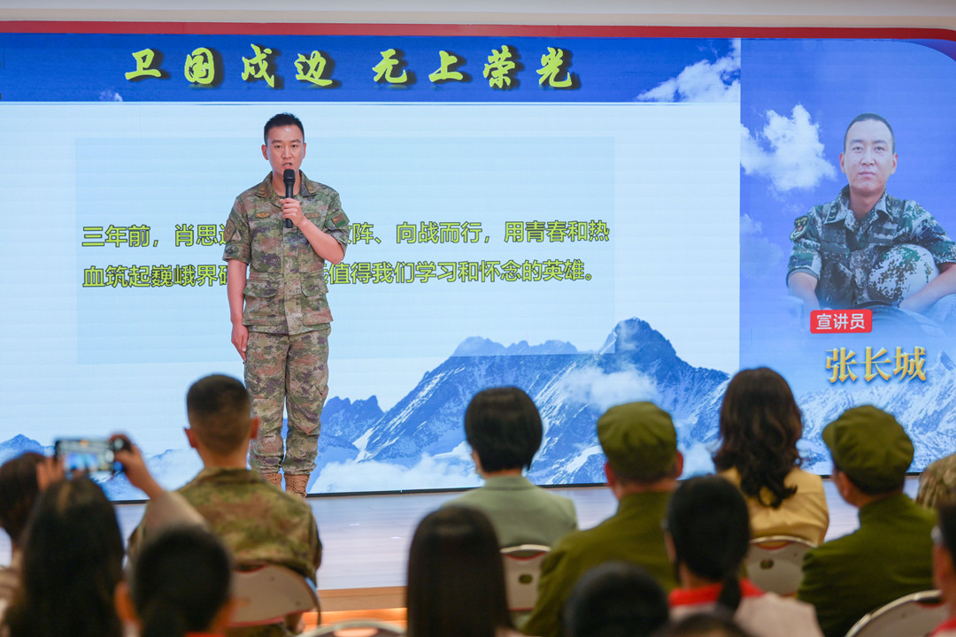 張長城:肖思遠(yuǎn)的名字永遠(yuǎn)留在連隊 “我是69316部隊加勒萬邊防連‘肖思遠(yuǎn)班’班長張長城,很高興今天有機會跟大家進行交流。三年前,肖思遠(yuǎn)班長兩闖敵陣、向戰(zhàn)而行,用青春和熱血筑起巍峨界碑,是永遠(yuǎn)值得我們學(xué)習(xí)和懷念的英雄……” 張長城現(xiàn)場作了主題為《衛(wèi)國戍邊 無上榮光》的宣講。 張長城說—— 肖班長犧牲后,連隊組建了“肖思遠(yuǎn)班”,班里有一張肖班長的床,每天晚上,戰(zhàn)士們都會將肖班長的被子打開,早上起床再將被子工工整整的疊好;晚上點名,班里的同志輪流向肖班長匯報本班和個人的工作。 連隊每天的點名,呼點的第一個名字永遠(yuǎn)是“肖思遠(yuǎn)”,全連齊聲答“到、到、到”,那一刻,感覺下面所有人,望過去都是他! ▌與現(xiàn)場基層干部群眾互動交流