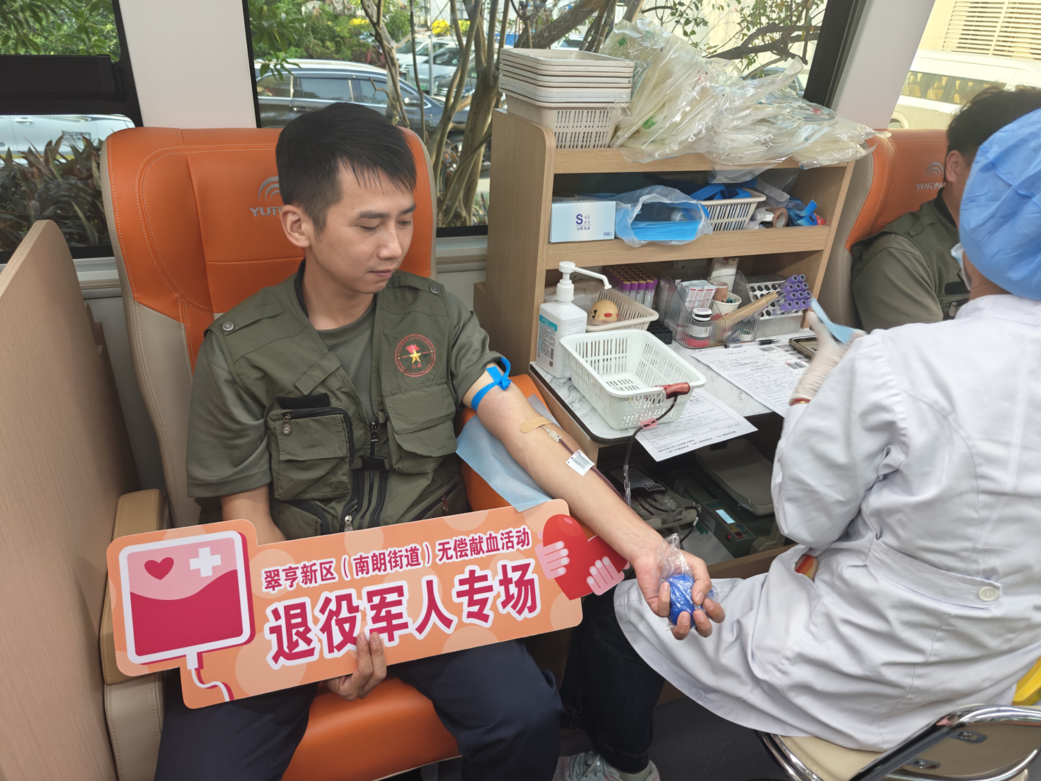 為弘揚“退役不褪色、退伍不退志”的軍人精神,保障臨床用血需求,傳遞社會正能量,2025年6月12日,南朗街道武裝部聯(lián)合退役軍人服務(wù)中心組織開展了“熱血鑄忠誠,奉獻(xiàn)顯擔(dān)當(dāng)”無償獻(xiàn)血活動專場。數(shù)十名退役軍人志愿者齊聚一堂,以實際行動詮釋了軍人的責(zé)任與擔(dān)當(dāng),為保障臨床用血貢獻(xiàn)力量。 活動當(dāng)天,退役軍人志愿者們身著綠色馬甲,在工作人員的引導(dǎo)下有序完成登記、體檢、獻(xiàn)血等環(huán)節(jié)。他們中既有退役不久的青年軍人,也有多年堅持獻(xiàn)血的“老將”。一位參與獻(xiàn)血的退役軍人表示:“獻(xiàn)血雖然是一件小事,但它能挽救一個生命,甚至是一個家庭的希望。作為退役軍人,我們有責(zé)任為社會作出更多貢獻(xiàn)?!?br/>