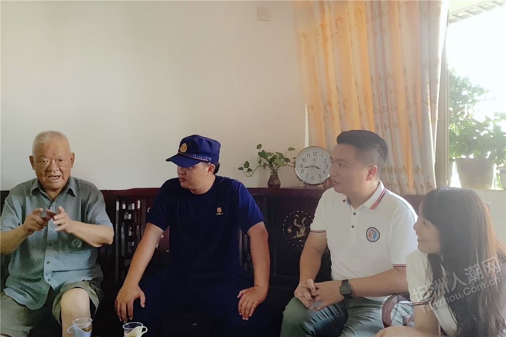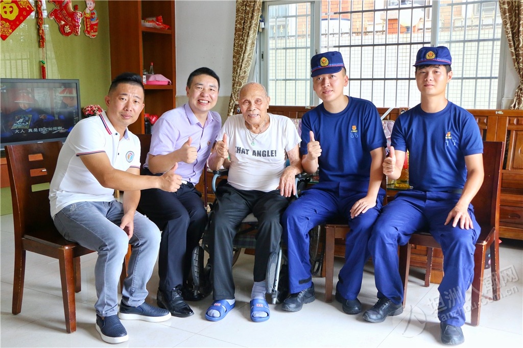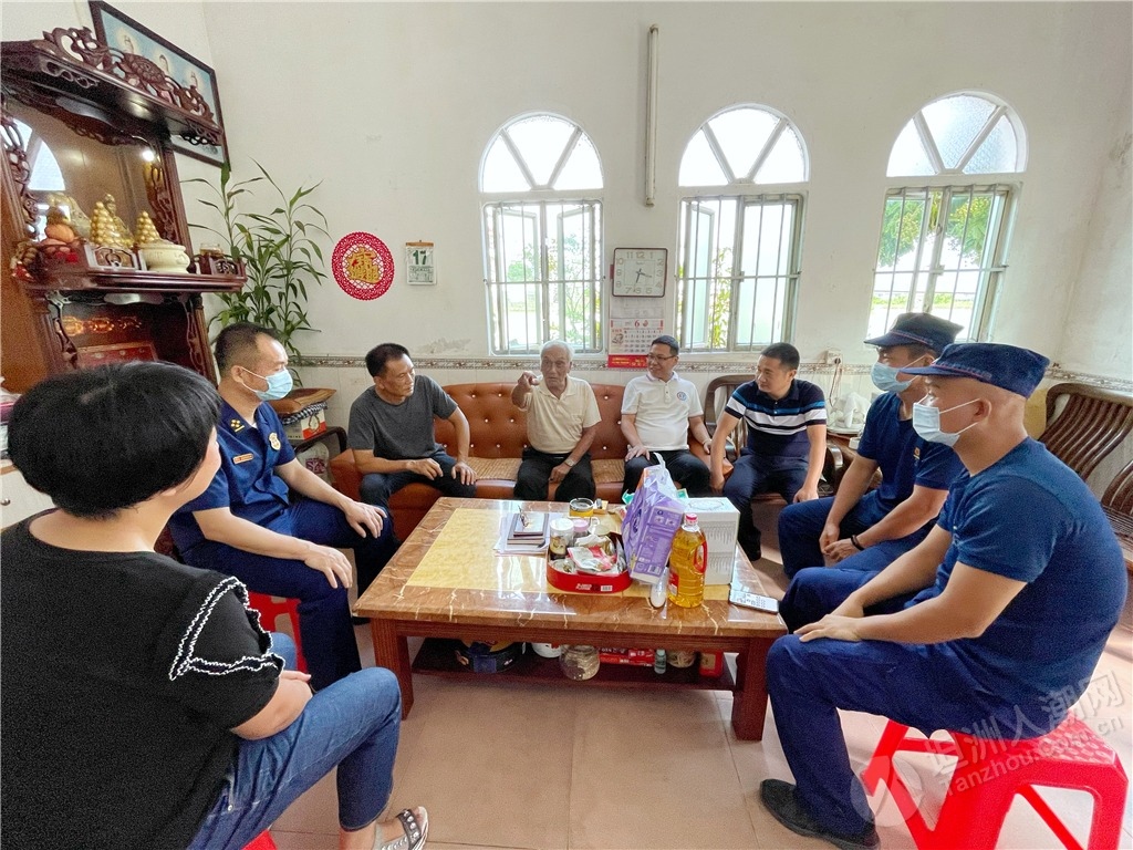 隨后,慰問組還邀請參戰(zhàn)老兵鄭金洪走進中山市消防救援支隊坦洲大隊講述革命故事,給與會黨員干部和部分基干民兵送上了一堂生動、鮮活的紅色教育黨課,讓全體人員感受參戰(zhàn)老兵的精神洗禮?!霸谝淮尾筷犠鲬?zhàn)時,我和另一名貴州籍的戰(zhàn)友去攻打一個火力點,我們一起在山腳的一塊石頭處掩護,但根據(jù)我以往的作戰(zhàn)經(jīng)驗,我覺得這里不安全,于是趕緊對他說不要待在那塊石頭那,也不要站立,趕緊滾到下面的公路去;好在他聽從我的命令后,迅速地做出反應(yīng)。當我們到達安全地方時,長舒一口氣,一直聽到有子彈嗖嗖嗖地從那塊石頭附近穿梭而過;而那位戰(zhàn)友感慨地跟我說‘班長,好在你迅速做出反應(yīng),不然我在那不是受傷就是死了?!编嵔鸷橐杂H身經(jīng)歷聲情并茂地向大家講述了當年戰(zhàn)火紛飛的戰(zhàn)斗經(jīng)歷。 ▲慰問組一行聆聽烈士遺屬陳北根講述他父親生前與敵斗爭的英雄故事。