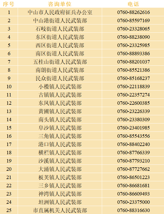 2025年全國征兵(男兵)應征報名已于12月1日開始。記者從中山市人民政府征兵辦公室獲悉,即日起,符合條件的青年可通過官方渠道報名參軍,對于征兵政策和流程存有疑問的市民,可通過撥打各鎮(zhèn)街征兵咨詢電話獲得詳細解答。 應征報名(男兵) 應征報名提示:男兵報名前須完成兵役登記 全國征兵(男兵)2025年應征報名時間 上半年應征報名:2024年12月1日至2025年2月10日24時 下半年應征報名:2024年12月1日至2025年8月10日24時 男兵應征報名對象 高中(含中專、職高、技校)畢業(yè)生及以上文化程度的青年(含高校在校生),年滿18至22周歲(2003年1月1日——2007年12月31日出生);普通高等學校本專科畢業(yè)生、上半年符合畢業(yè)條件的畢業(yè)班學生,年滿18至24周歲;研究生畢業(yè)生及在校生放寬至26周歲;初中畢業(yè)文化程度男青年,年滿18至20周歲。 應征報名(女兵) 全國征兵(女兵)2025年應征報名時間 上半年應征報名:2025年1月1日至2025年2月10日24時 下半年應征報名:2025年7月1日至2025年8月10日24時 女兵應征報名對象 上半年應征報名:普通高等學校和科研機構全日制應屆畢業(yè)生及在校生,年滿18至22周歲(2003年1月1日——2007年12月31日出生),全日制研究生應屆畢業(yè)生及在校生放寬至26周歲;2024年普通高等學校全日制本??茟獙卯厴I(yè)生可以報名參加2025年上半年女兵征集,年齡放寬至23周歲。 下半年應征報名:普通高中應屆畢業(yè)生、普通高等學校和科研機構全日制應屆畢業(yè)生及在校生,年滿18至22周歲(2003年1月1日——2007年12月31日出生),全日制研究生應屆畢業(yè)生及在校生放寬至26周歲。 報名方式 報名方式征兵報名官方網站:全國征兵網 www.gfbzb.gov.cn 軍隊媒體移動旗艦客戶端:中國軍號App 中山各鎮(zhèn)街征兵咨詢電話