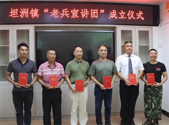 7月26日,中山市坦洲鎮(zhèn)成立全市鎮(zhèn)街首個(gè)“老兵宣講團(tuán)”。中山市退役軍人事務(wù)局、中山市退役軍人服務(wù)中心,坦洲鎮(zhèn)公共服務(wù)辦公室、退役軍人服務(wù)中心等單位相關(guān)負(fù)責(zé)人,坦洲鎮(zhèn)“老兵宣講團(tuán)”成員等出席成立儀式。 成立儀式現(xiàn)場(chǎng),坦洲鎮(zhèn)退役軍人服務(wù)中心負(fù)責(zé)人簡(jiǎn)要介紹了“老兵宣講團(tuán)”成立的目的、任務(wù)及宣講團(tuán)成員的基本情況。相關(guān)領(lǐng)導(dǎo)為“老兵宣講團(tuán)”授旗,并頒發(fā)聘用證書。  ▲坦洲鎮(zhèn)老兵宣講團(tuán)成員獲頒聘書。