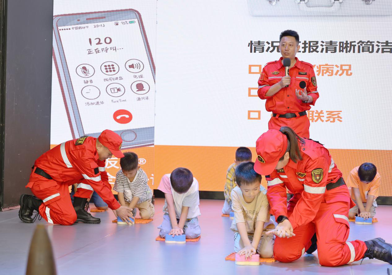 中山市擁軍支前紅旗服務隊隊長孫宏寧通過安全教育宣傳片、實際案例、情景模擬、互動問答等形式,從應急救護、如何進行心肺復蘇、120呼叫需要提何種信息等與青少年生活息息相關的內容為小營友們講授暑期“安全第一課”,讓安全意識、安全技能深入到在場每位學生、每個家庭,希望小營友們在快樂過暑假的同時安全不“放假”。  國防教育現(xiàn)場。