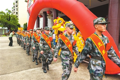新兵們身穿戎裝、肩披紅綬帶,整齊列隊(duì)奔赴軍營(yíng)。通訊員供圖