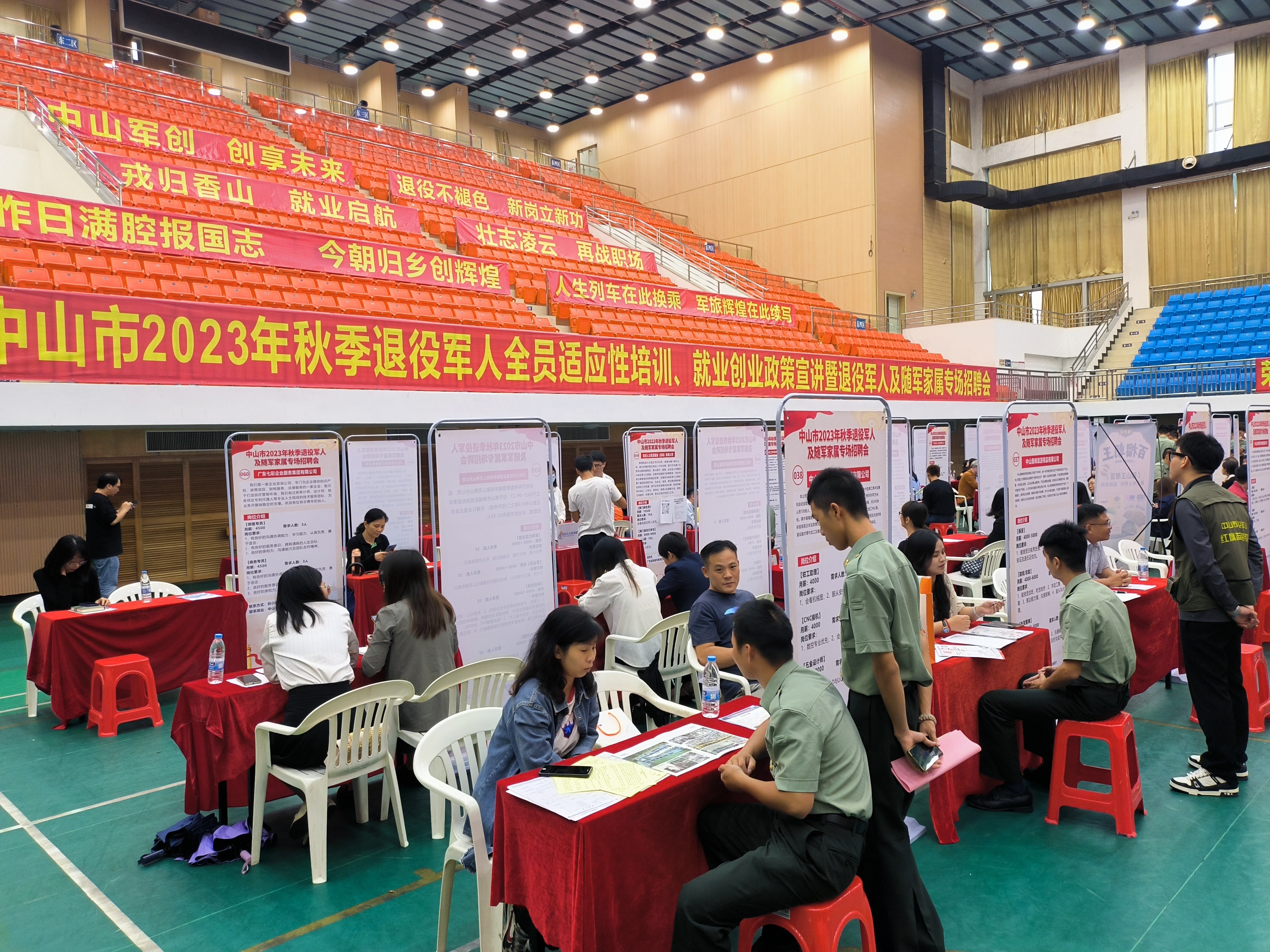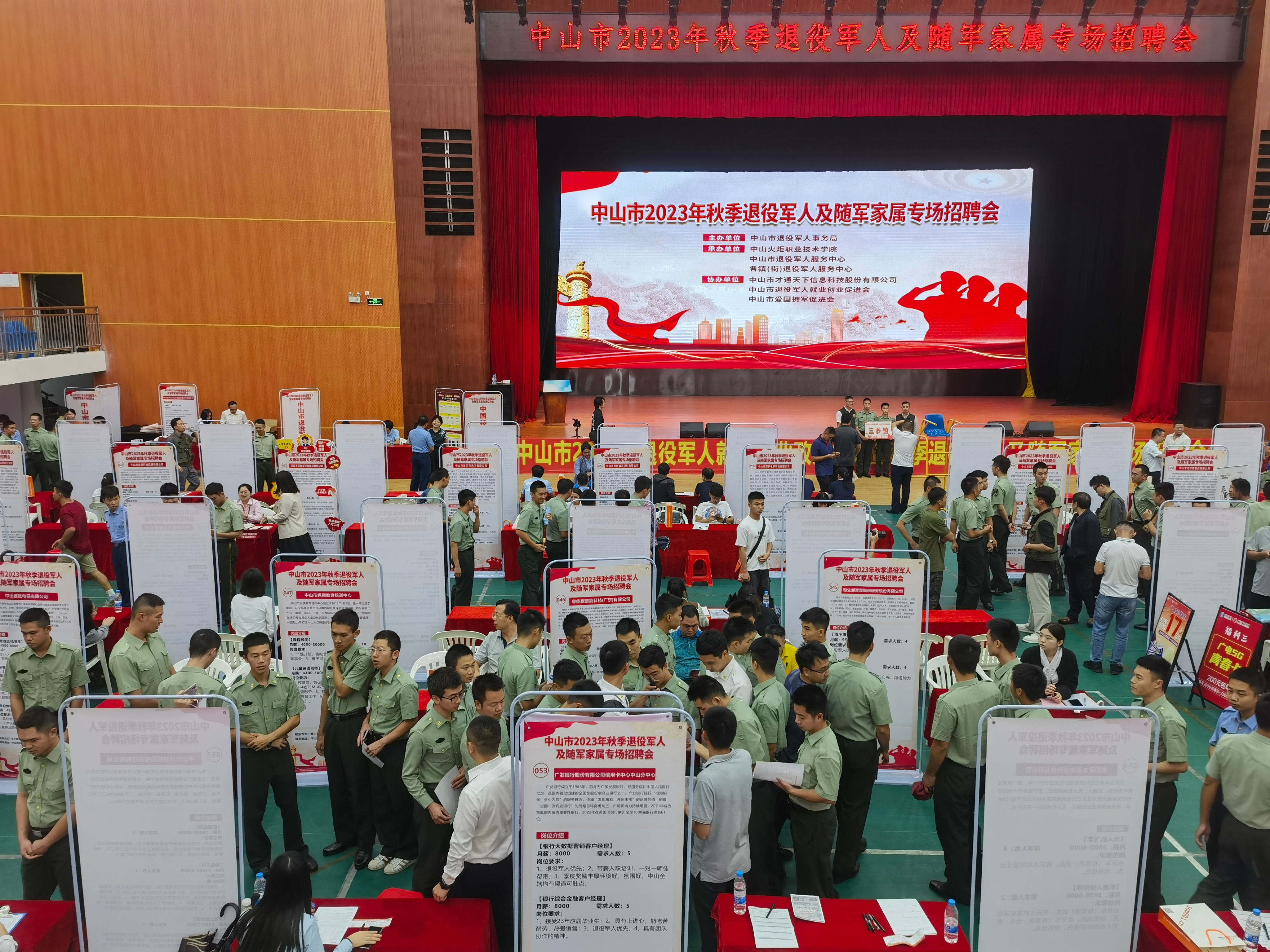 中山市2023年秋季退役軍人及隨軍家屬專(zhuān)場(chǎng)招聘會(huì)現(xiàn)場(chǎng)。(市退役軍人事務(wù)局供圖) 為深入開(kāi)展“我為群眾辦實(shí)事”實(shí)踐活動(dòng),推動(dòng)主題教育走深走實(shí)、見(jiàn)行見(jiàn)效,10月20日下午,中山市2023年秋季退役軍人及隨軍家屬專(zhuān)場(chǎng)招聘會(huì)在中山火炬職業(yè)技術(shù)學(xué)院體育館成功舉辦。專(zhuān)場(chǎng)招聘會(huì)由中山市退役軍人事務(wù)局主辦,中山火炬職業(yè)技術(shù)學(xué)院、中山市退役軍人服務(wù)中心、各鎮(zhèn)(街)退役軍人服務(wù)中心承辦,中山市才通天下信息科技股份有限公司、中山市退役軍人就業(yè)創(chuàng)業(yè)促進(jìn)會(huì)、中山市愛(ài)國(guó)擁軍促進(jìn)會(huì)協(xié)辦。