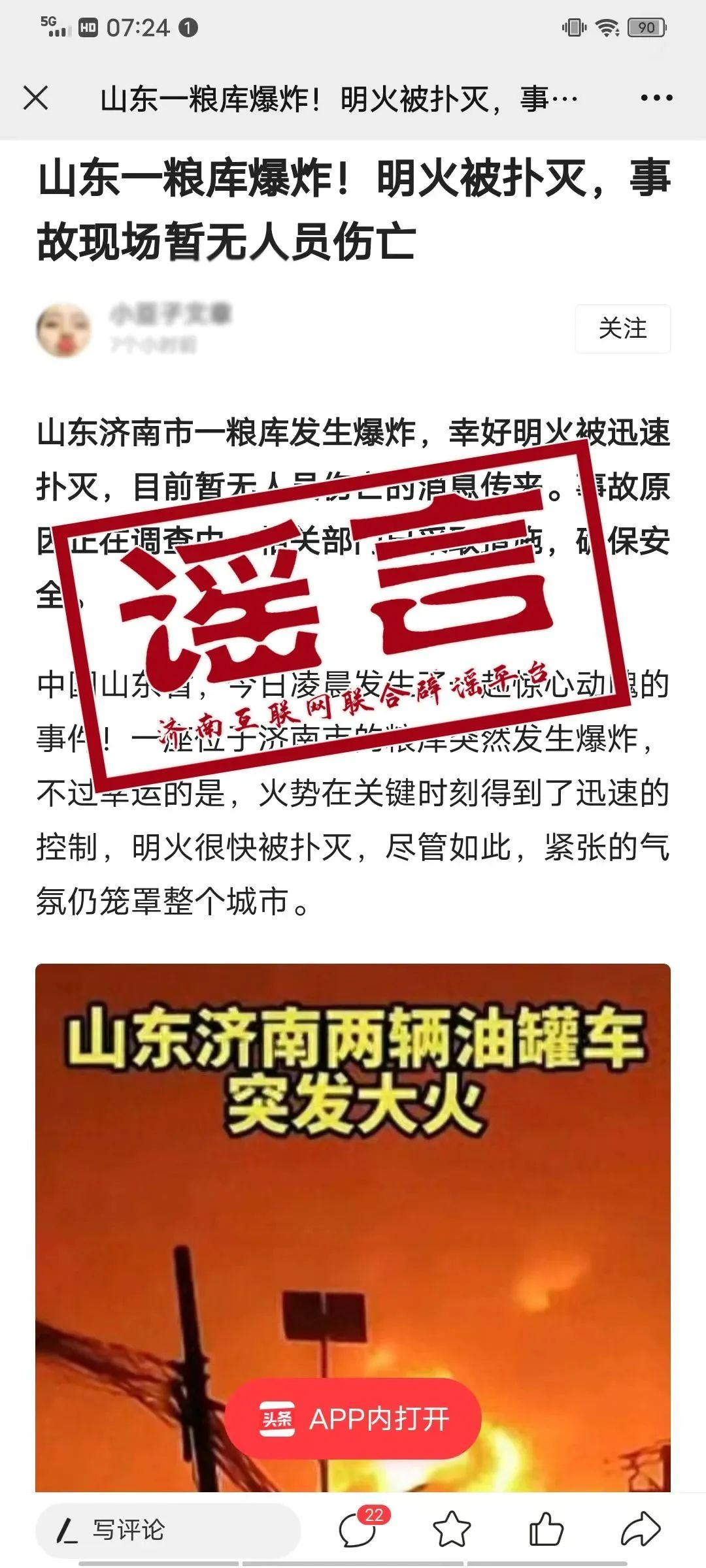 1月20日晚,有網(wǎng)民在社交平臺(tái)發(fā)布“山東濟(jì)南市一糧庫(kù)發(fā)生爆炸。火勢(shì)在關(guān)鍵時(shí)刻得到了迅速的控制,明火很快被撲滅,盡管如此,緊張的氣氛仍籠罩整個(gè)城市”消息,所配圖片顯示為“濟(jì)南兩輛油罐車突發(fā)大火”,引發(fā)了網(wǎng)友熱議。