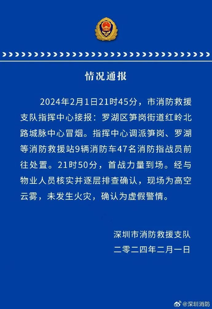 深圳市消防救援支隊(duì)指揮中心調(diào)派筍崗、羅湖等消防救援站9輛消防車47名消防指戰(zhàn)員前往處置。21時(shí)50分,首戰(zhàn)力量到場。經(jīng)與物業(yè)人員核實(shí)并逐層排查確認(rèn),現(xiàn)場為高空云霧,未發(fā)生火災(zāi),確認(rèn)為虛假警情。