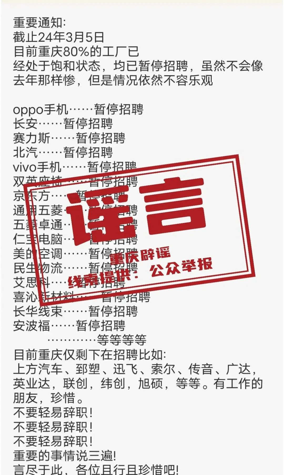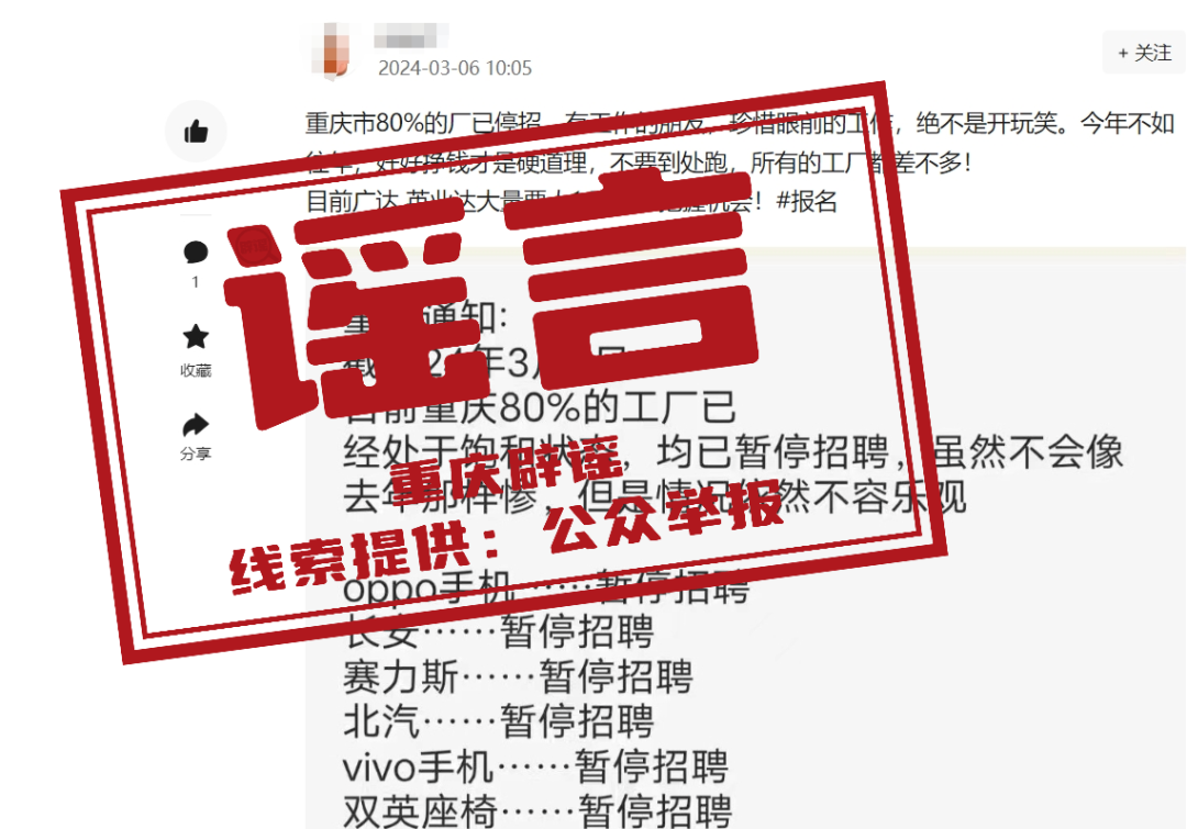 近日,有網(wǎng)民在某網(wǎng)絡(luò)平臺上發(fā)布信息:“目前重慶市80%的廠已處于飽和狀態(tài),均已暫停招聘”,引發(fā)社會關(guān)注。經(jīng)相關(guān)部門核實,網(wǎng)傳信息為謠言。