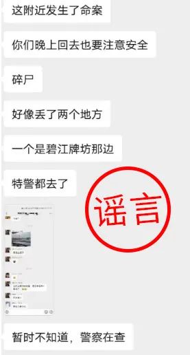 4月22日上午,網(wǎng)民莫某(男,28歲)在其小區(qū)業(yè)主群發(fā)布消息,稱(chēng)“最近幾天碧江附近發(fā)生了命案”。隨后,該謠言被陳某(女,38歲)刷到,在未驗(yàn)證真實(shí)情況下,陳某將謠言轉(zhuǎn)發(fā)到聊天群,并發(fā)表“北滘發(fā)生碎尸案”等不實(shí)言論。最終導(dǎo)致多名網(wǎng)友在未經(jīng)證實(shí)的情況下,轉(zhuǎn)發(fā)謠言到多個(gè)微信群內(nèi),造成較惡劣的社會(huì)影響。