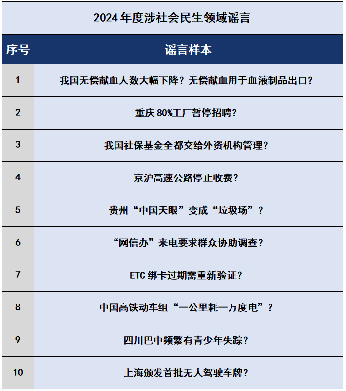 2024年2月,個(gè)別自媒體發(fā)出“無(wú)償獻(xiàn)血人數(shù)大幅下降,無(wú)償獻(xiàn)血用于血液制品出口”的不實(shí)言論,利用全社會(huì)對(duì)公益事業(yè)的關(guān)注和信息不對(duì)稱誤導(dǎo)公眾,故意抹黑我無(wú)償獻(xiàn)血政策,影響血液采集正常秩序,引發(fā)公眾對(duì)無(wú)償獻(xiàn)血的誤解。一些別有用心之人惡意編造謠言“我國(guó)社保基金全都交給外資機(jī)構(gòu)管理”,抓住社保基金管理中的部分正常合作進(jìn)行夸大和錯(cuò)誤解讀,以偏概全、歪曲事實(shí),引發(fā)公眾對(duì)社保體系的擔(dān)憂和恐慌。還有一些自媒體夸大其詞、虛構(gòu)數(shù)據(jù),捏造謠言“重慶80%工廠暫停招聘”,干擾勞動(dòng)力市場(chǎng)正常秩序,影響地區(qū)經(jīng)濟(jì)發(fā)展。所謂“‘網(wǎng)信辦’來(lái)電要求群眾協(xié)助調(diào)查”則實(shí)為詐騙分子冒充權(quán)威機(jī)構(gòu)行騙,嚴(yán)重?fù)p害政府部門的公信力。