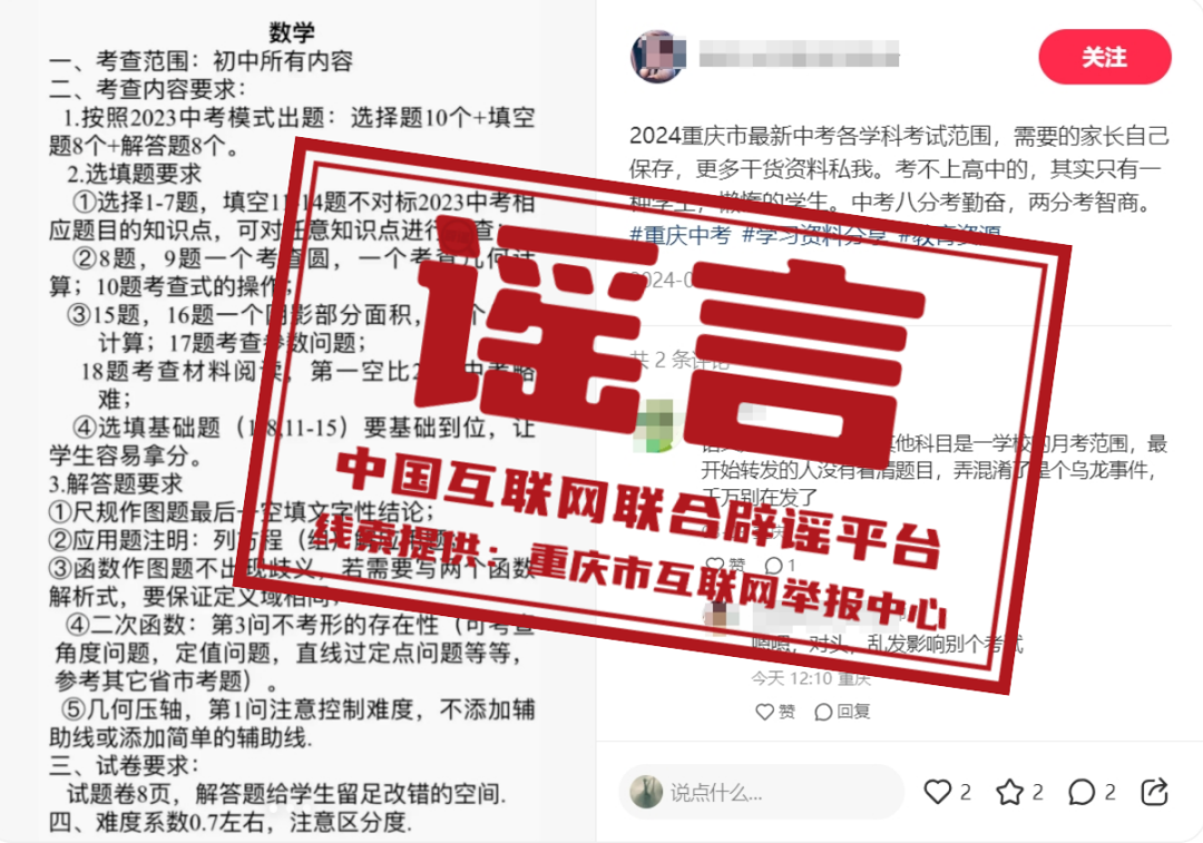 真相:近日,有網(wǎng)民發(fā)布2024年重慶中考各學(xué)科“考查范圍、考查內(nèi)容要求、試卷要求和難度系數(shù)”等信息,引發(fā)關(guān)注。經(jīng)核實,重慶市教育科學(xué)研究院有關(guān)研討會尚未召開,且會前未發(fā)布任何有關(guān)中考各學(xué)科命題信息。重慶市教育科學(xué)研究院表示,網(wǎng)上傳播的各學(xué)科“考查范圍、考查內(nèi)容要求、試卷要求和難度系數(shù)”等內(nèi)容均為虛假信息。(來源:重慶辟謠)