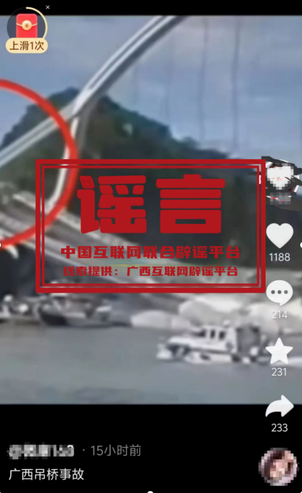真相:近日,有網(wǎng)民在短視頻平臺發(fā)布內(nèi)容為吊橋垮塌事故的視頻,并稱該事故發(fā)生在廣西境內(nèi),引發(fā)網(wǎng)民關(guān)注。視頻顯示,一吊橋繩索斷裂導(dǎo)致橋體垮塌,一輛來不及過橋的貨車也落入水中。經(jīng)廣西互聯(lián)網(wǎng)辟謠平臺核實比對,網(wǎng)傳“廣西吊橋垮塌事故”視頻實際上為2019年臺灣南方澳大橋發(fā)生吊桿斷裂并導(dǎo)致橋梁垮塌。網(wǎng)傳視頻系移花接木造謠。(來源:“廣西互聯(lián)網(wǎng)違法和不良信息舉報中心”微信公眾號)