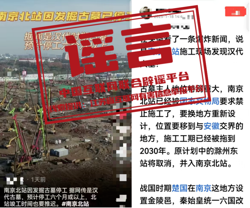 真相:近日,有網(wǎng)民在網(wǎng)絡(luò)平臺(tái)發(fā)帖稱,南京北站因挖到古墓,“已經(jīng)被國(guó)家文物局要求禁止施工了”“預(yù)計(jì)停工六個(gè)月或以上”“施工工期已經(jīng)被拖到2030年”等。經(jīng)江蘇省互聯(lián)網(wǎng)辟謠平臺(tái)與省文物部門和屬地核實(shí),目前沒(méi)有收到國(guó)家文物局關(guān)于“南京北站禁止施工”的有關(guān)通知,南京北站除個(gè)別涉及考古發(fā)掘作業(yè)區(qū)域外,其他施工作業(yè)均按計(jì)劃正常有序推進(jìn),網(wǎng)傳信息系謠言。(來(lái)源:江蘇省互聯(lián)網(wǎng)辟謠平臺(tái)、“南京網(wǎng)絡(luò)辟謠”微信公眾號(hào))