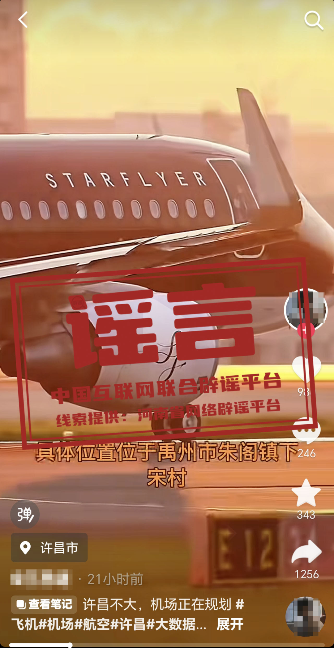 謠 言 河南許昌已明確通用機(jī)場(chǎng)的選址和投資金額?