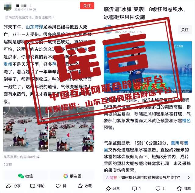 真相:7月11日,有個(gè)別自媒體賬號(hào)發(fā)布信息稱“昨天下午,山東菏澤龍卷風(fēng)已經(jīng)導(dǎo)致五人死亡,八十三人受傷”并配發(fā)相關(guān)圖片,引發(fā)關(guān)注。經(jīng)核實(shí)查證,菏澤市7月10日并未發(fā)生龍卷風(fēng),網(wǎng)傳消息系謠言。此外,另一自媒體賬號(hào)近日發(fā)布“臨沂遭‘冰彈’突襲!8級(jí)狂風(fēng)卷積水,冰雹砸爛果園設(shè)施”等信息。經(jīng)向臨沂市氣象部門核實(shí),近期臨沂市未發(fā)生大風(fēng)冰雹天氣,上述信息與實(shí)際情況不符,確為謠言。請(qǐng)廣大網(wǎng)民以氣象部門發(fā)布的信息為準(zhǔn),勿輕信、勿傳播非正規(guī)來(lái)源或未經(jīng)證實(shí)的信息。(來(lái)源:山東省互聯(lián)網(wǎng)違法和不良信息舉報(bào)中心)