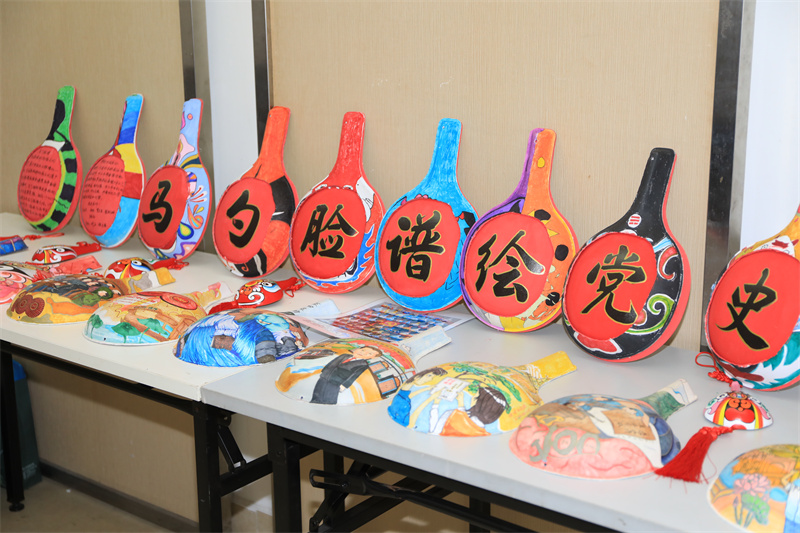 中國(guó)共產(chǎn)黨成立100周年標(biāo)識(shí)、井岡山勝利會(huì)師、南昌起義、嘉興游船上舉行的中共一大、萬里長(zhǎng)征路……分享會(huì)現(xiàn)場(chǎng),刻畫了一個(gè)個(gè)黨史故事的木瓢排列成行,十分引人注目?!斑@是國(guó)家級(jí)非物質(zhì)文化遺產(chǎn)——馬勺臉譜。它是陜西的傳統(tǒng)民間藝術(shù),以馬勺作‘紙’,將社火臉譜以彩繪的形式繪制在上面。”馬勺臉譜傳承者、沙溪中學(xué)老師馬世杰介紹。作為一名美術(shù)老師,馬世杰通過民間藝術(shù)的再創(chuàng)新來引導(dǎo)學(xué)生學(xué)習(xí)黨史,在他的帶領(lǐng)下,沙溪中學(xué)的學(xué)生將南粵特色、中山元素、國(guó)風(fēng)動(dòng)漫等融入馬勺臉譜的創(chuàng)作中。“繪制黨史故事前,我們查閱了大量資料,并向?qū)<覍W(xué)者請(qǐng)教,在創(chuàng)作中引導(dǎo)學(xué)生們了解、學(xué)習(xí)黨史?!?/p>